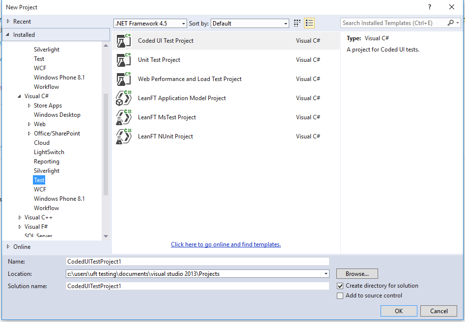 In this article we will discuss about how to create a basic test using HP’s LeanFT. To create the first test, you need to have visual studio 2012 or 2013 or Eclipse(I will write another post or explaining eclipse LeanFT integration) installed with HP’s LeanFT (Except express edition of visual studio). For this post we will use visual studio for writing LeanFT tests. Make sure that you install visual studio first.