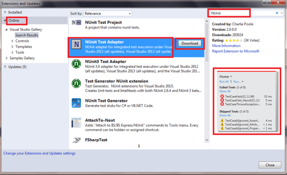 - In visual studio, open Tools->Extensions and updates->online and search for NUnit. Select Download.