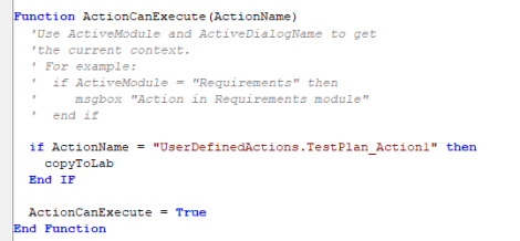 if ActionName = "UserDefinedActions.TestPlan_Action1" then copyToLab End IFWe will create copyToLab function next. The whole “ActionCanExecute” function should look like this