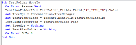 TestPlanFolderID = TestFolder_Fields.Field("AL_ITEM_ID").Value set TreeMgr = TDConnection.TreeManager set TestPlanFolder = TreeMgr.NodeByID(TestPlanFolderID) TestPlanFolderPath = TestPlanFolder.Path Set TreeMgr = Nothing set TestPlanFolder = NothingThe whole function should look like this
