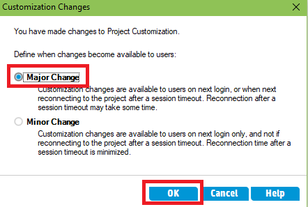 9. Click on Return on the upper right corner of ALM, select Major change on the Customization changes window and Click on OK Button.